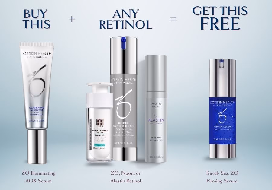 When you purchase the ZO Illuminating AOX Serum and any qualifying retinol product you will receive a free travel-size ZO Firming Serum. This trio works together to protect against environmental damage and keep your skin looking youthful and tight. It is everything you need for a professional-grade regimen in one simple routine.